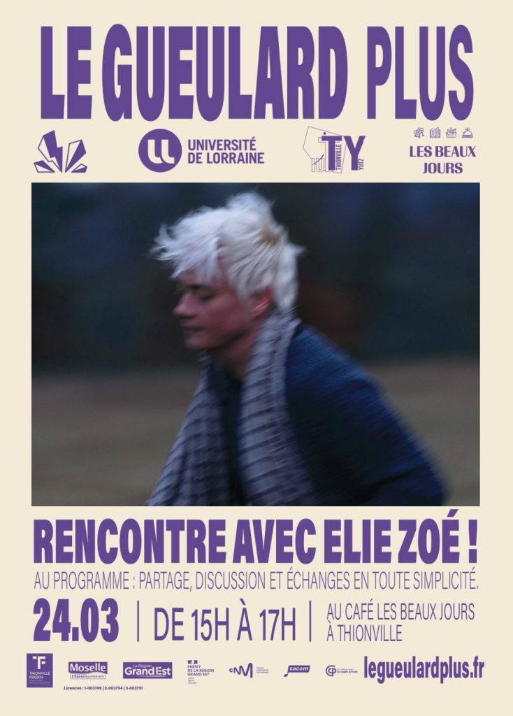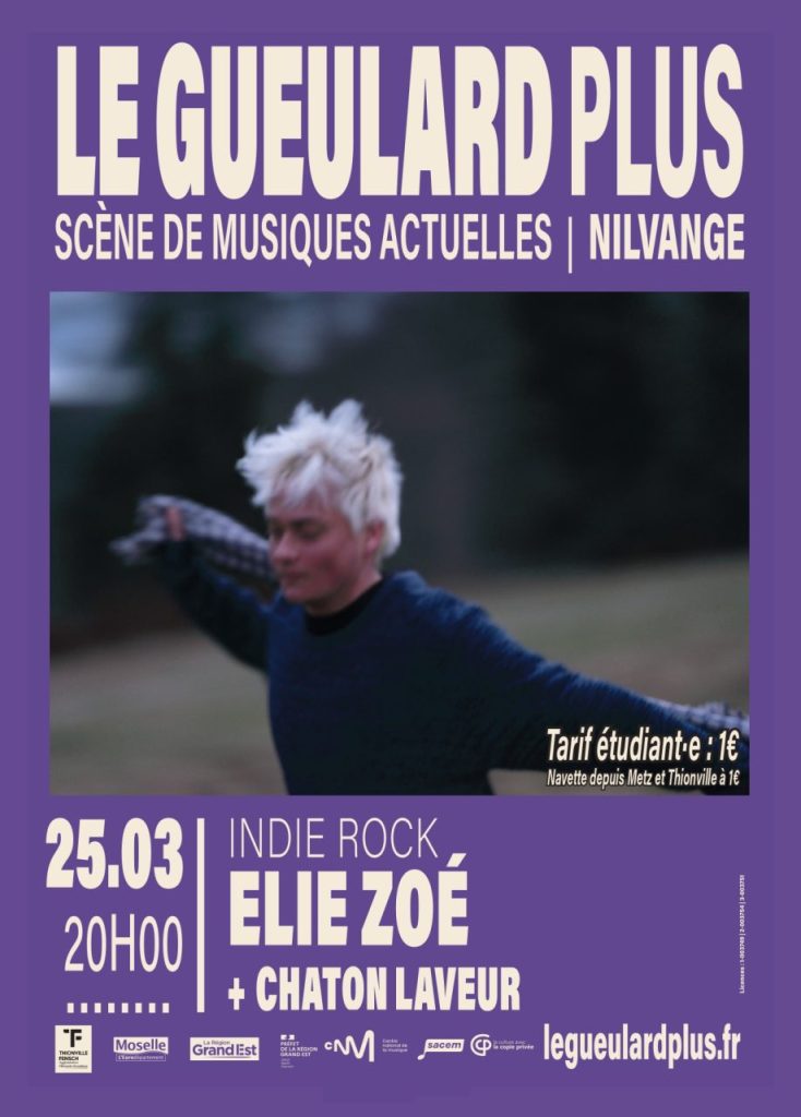 Le lendemain, le 25 mars à 20h, Elie Zoé se produira sur la scène du Le Gueulard Plus (3 rue Victor Hugo, 57 240 Nilvange). Labellisée Scène de Musiques Actuelles par le ministère de la Culture, cette salle est un lieu majeur de diffusion et d’accompagnement des musiques actuelles sur le territoire.